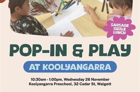 Pop in & Play - Koolyangarra Preschool 26 Nov 2025 Join us for a special day of fun & discovery! Come along and see what a day at preschool looks like, meet our friendly team and enjoy hands on activities designed for families and future preschoolers. Koolyangarra Preschool, 32 Cedar Street, Walgett 2832 Tagged as: , Kids & family